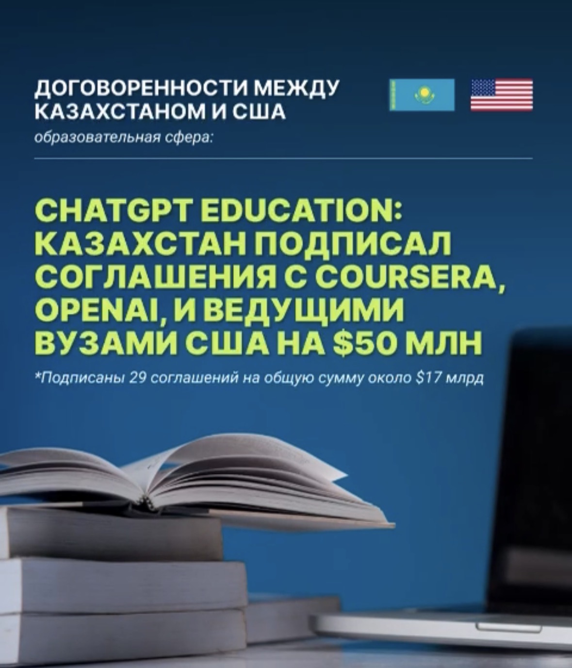 Қазақстан Coursera, OpenAI, Arizona State University және Colorado School of Mines университеттерімен жалпы құны 50 миллион доллар болатын келісімдерге қол қойды.