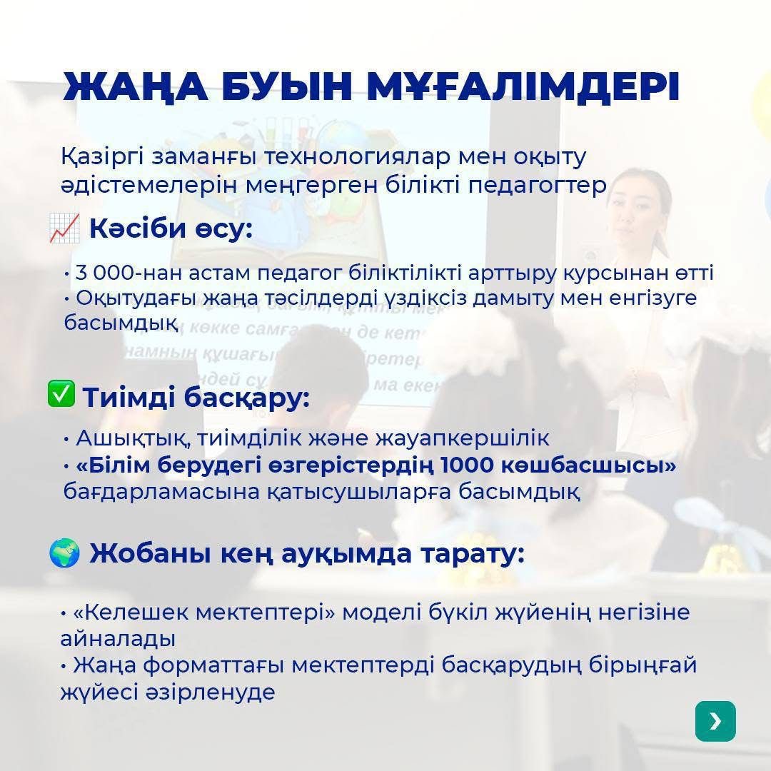 «Келешек мектептері» жобасы – жоғары сапалы білім беру стандарттарын жаппай енгізу арқылы, әр баланың жан-жақты дамуына және өз әлеуетін толық ашуға теңдей мүмкіндіктер жасалуда.