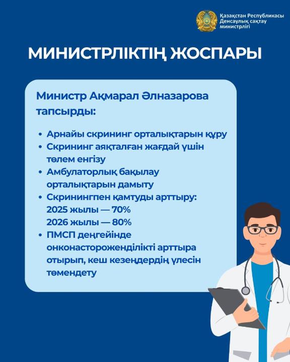 «Скринингтің аяқталған жағдайы үшін ақы төленетін мамандандырылған скринингтік орталықтарды, сондай-ақ онкопациенттерді амбулаториялық бақылау орталықтарын құруды пысықтау. Өңірлік басқармаларға - халықты скринингтермен қамтуды 2025 жылы кемінде 70%-ға дейін арттыру және бұл көрсеткішті 2026 жылы 80% - ға дейін жеткізу, сондай-ақ МСАК деңгейінде онкологиялық сақтандыруды арттыру арқылы кейінгі кезеңдердің үлесін азайту», – деп тапсырды Денсаулық сақтау министрі Ақмарал Әлназарова онкологиялық бағдарламаны іске асыру қорытындыларын тыңдау қорытындысы бойынша.