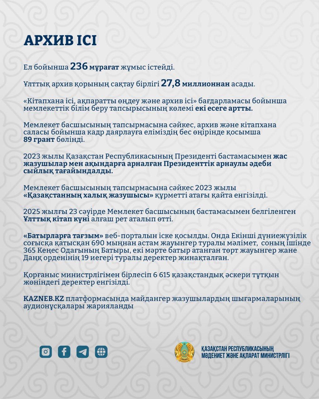 ✔️«Архив – 2025» жобасы аясында 14 елден мыңнан астам бірегей тарихи құжат жиналды. Архив материалдарын сақтау мен бірыңғай электрондық архивтің құқықтық негізін қалыптастыруға бағытталған жаңа заң жобасы әзірленіп жатыр.