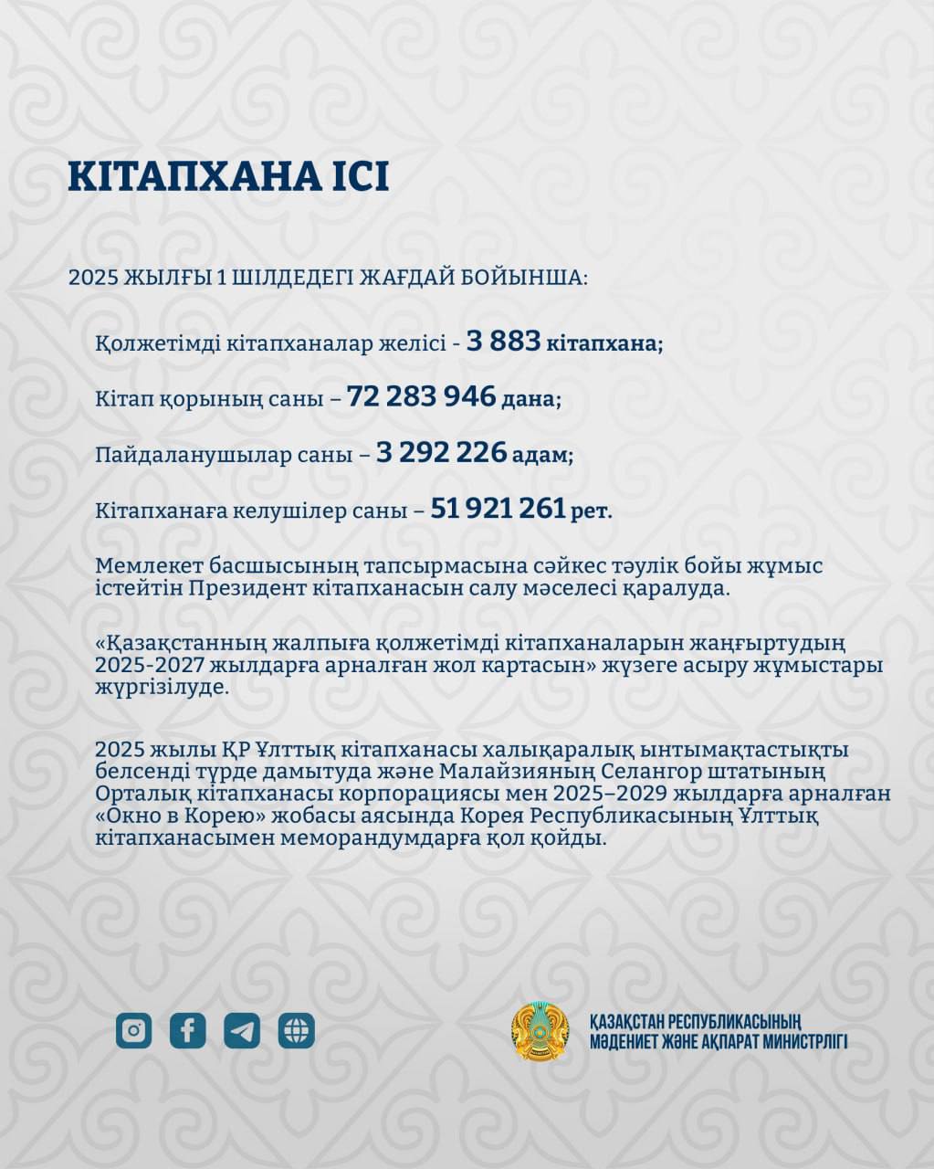 Білікті мамандар даярлау мақсатында «Кітапхана ісі, ақпаратты өңдеу және архив ісі» бағыты бойынша мемлекеттік білім беру тапсырысы екі есе өсті – бакалавриат бойынша грант саны 20-дан 100-ге дейін көбейді. Мемлекет басшысының тапсырмасына сәйкес, архив және кітапхана саласы бойынша кадр даярлауға еліміздің бес өңірінде қосымша 89 грант бөлінді.