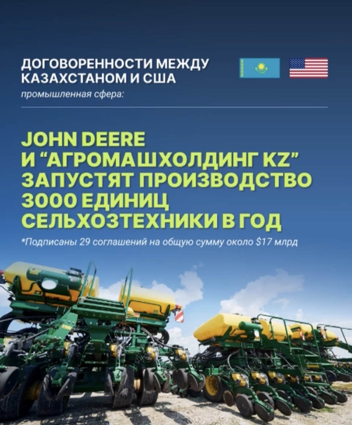 John Deere, «АгромашХолдинг KZ» АҚ және серіктестер арасында құны 2,5 миллиард доллар болатын стратегиялық келісімге қол қойылды.