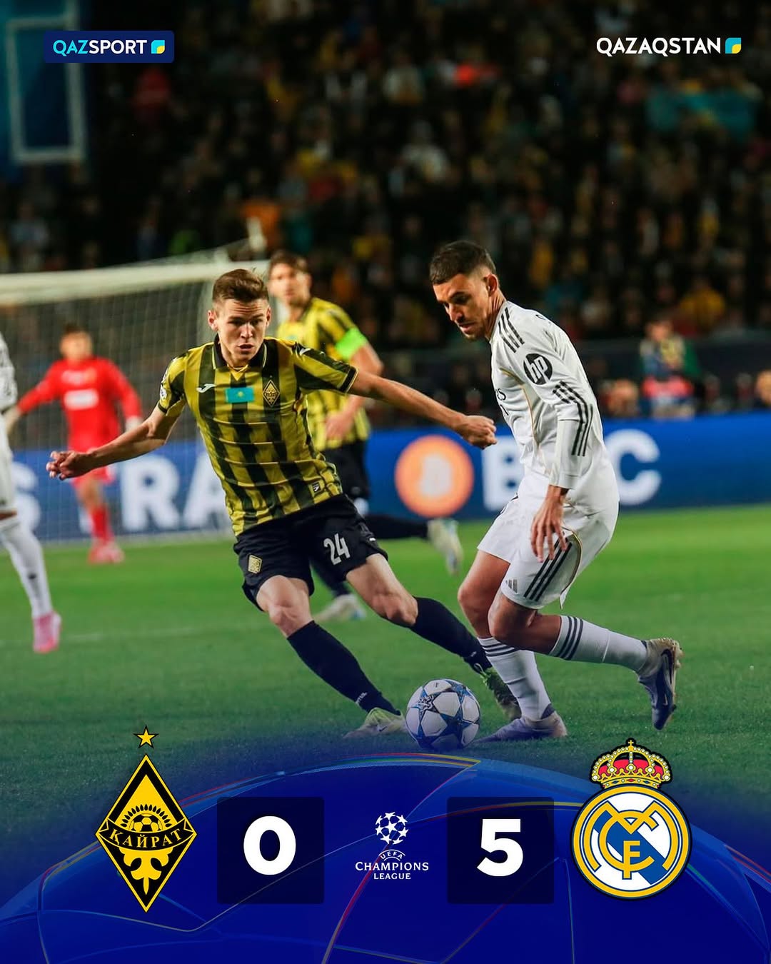 Алматыда тарихи ойын өтті. Қазақстандық «Қайрат» футбол клубы Чемпиондар лигасы аясында әлемнің ең беделді командаларының бірі, турнирдің 15 дүркін жеңімпазы – «Реал Мадридті» қабылдады.