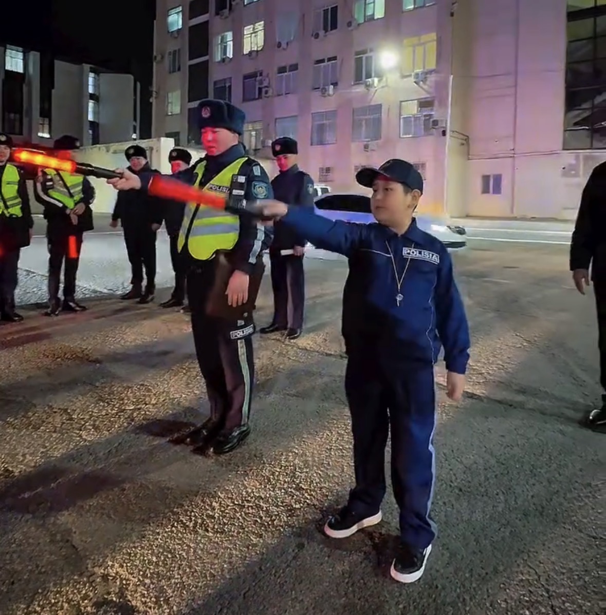 Жас сақшы патрульдік полиция батальон қызметкерлерімен бірге саптық жиынға қатысып, тәртіп сақшыларының күнделікті қызметке қалай дайындалатынын көрді. Бұйрық беру, сап түзеу, бағыт-бағдар алып, өзін нағыз полицейдей сезінді.