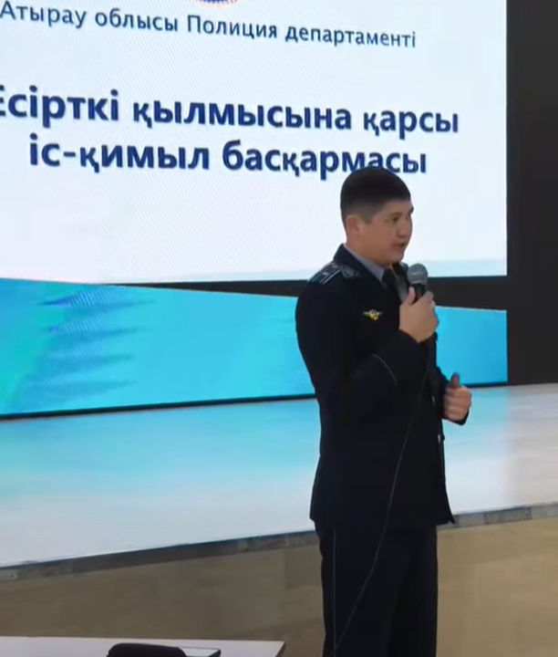 Атырау облысы полиция департаментінің Есірткі қылмысына қарсы іс-қимыл басқармасының жедел уәкілі Айбол Ідірісов №27 орта мектептің жоғары сынып оқушыларымен «Есірткісіз болашақ» тақырыбында профилактикалық кездесу өткізді. Кездесу барысында оқушыларға қоғамдағы нашақорлықтың таралу себептері, оның адам денсаулығына, болашағына және жалпы қоғамға тигізетін кері әсері жан-жақты түсіндірілді. Сондай-ақ, есірткіге тәуелділіктің алдын алу жолдары, күмәнді жағдайлардан сақтану, бос уақытты тиімді әрі пайдалы өткізу, жеке қауіпсіздік ережелерін сақтау жөнінде нақты кеңестер берілді. Іс-шара аясында Кинология қызмет орталығының қызметкері Хан лақап есімді қызметтік иттің көмегімен есірткі заттарын анықтау барысын тәжірибе жүзінде көрсетіп, оқушылардың қызығушылығын арттырды. Бұл көрініс жасөспірімдерге құқық қорғау органдарының есірткі қылмысына қарсы күрестегі күнделікті жұмысы туралы нақты түсінік берді.
